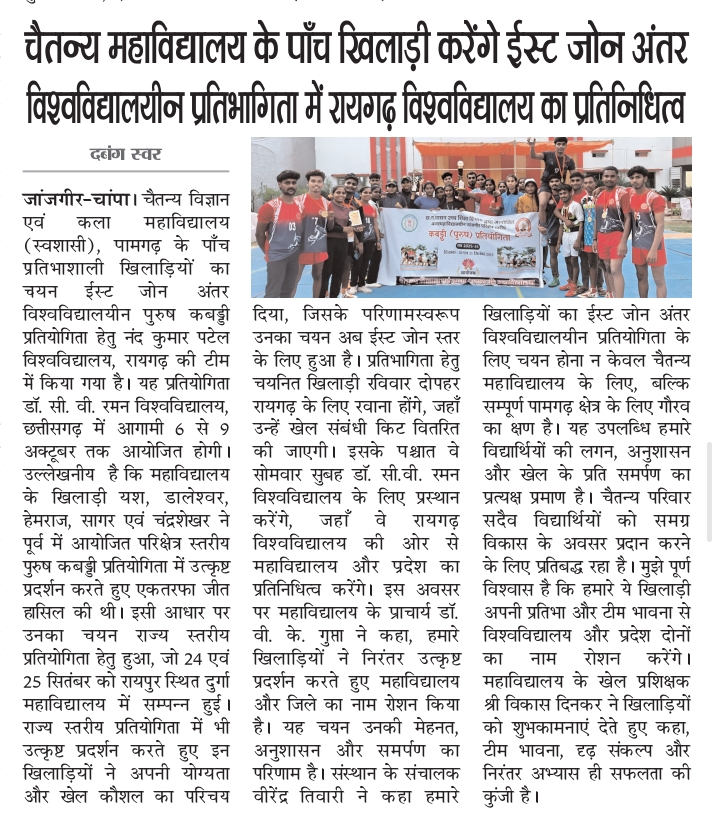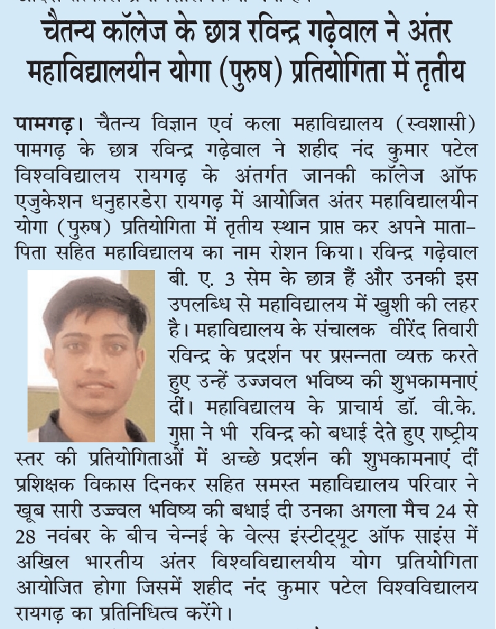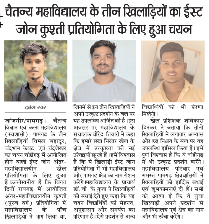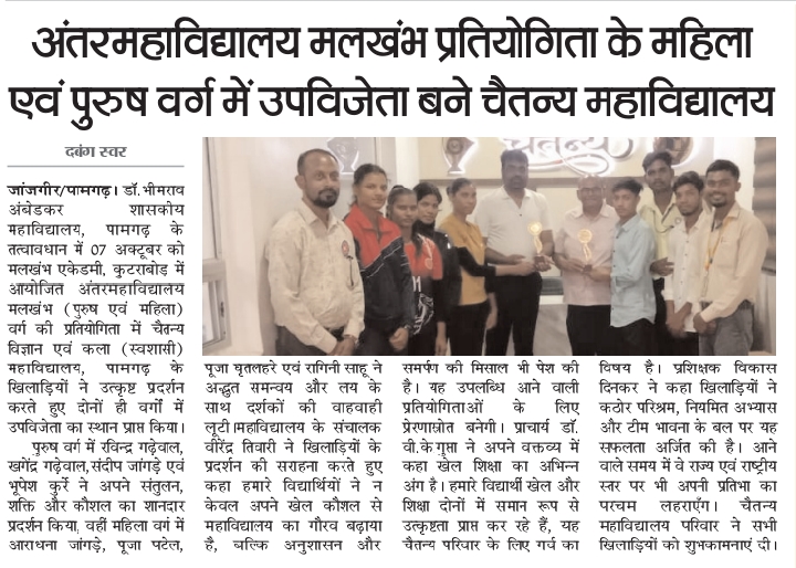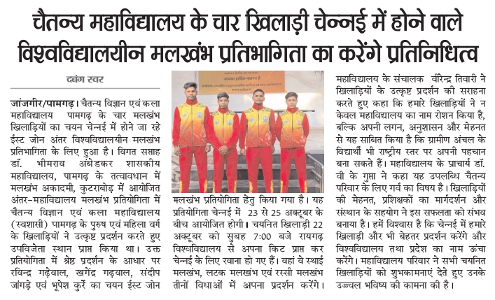 चैतन्य विज्ञान एवं कला महाविद्यालय (स्वशासी) पामगढ़ के चार मलखंभ खिलाड़ियों — रविन्द्र गढ़वाल, खगेंद्र गढ़वाल, संदीप जांगड़े और भूपेश कुर्रे — का चयन चेन्नई में आयोजित होने वाली ईस्ट जोन अंतर विश्वविद्यालयीन मलखंभ प्रतियोगिता के लिए हुआ है। खिलाड़ियों ने हाल ही में पामगढ़ में आयोजित अंतर-महाविद्यालयीन मलखंभ प्रतियोगिता में उत्कृष्ट प्रदर्शन करते हुए उपविजेता स्थान प्राप्त किया था। महाविद्यालय के संचालक वीरेन्द्र तिवारी और प्राचार्य डॉ. वी. के. गुप्ता ने खिलाड़ियों की उपलब्धि पर गर्व व्यक्त करते हुए उनके उज्ज्वल भविष्य की शुभकामनाएं दीं।
