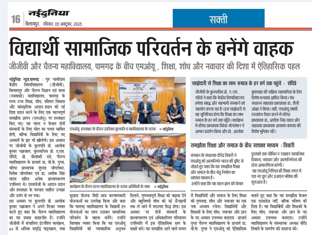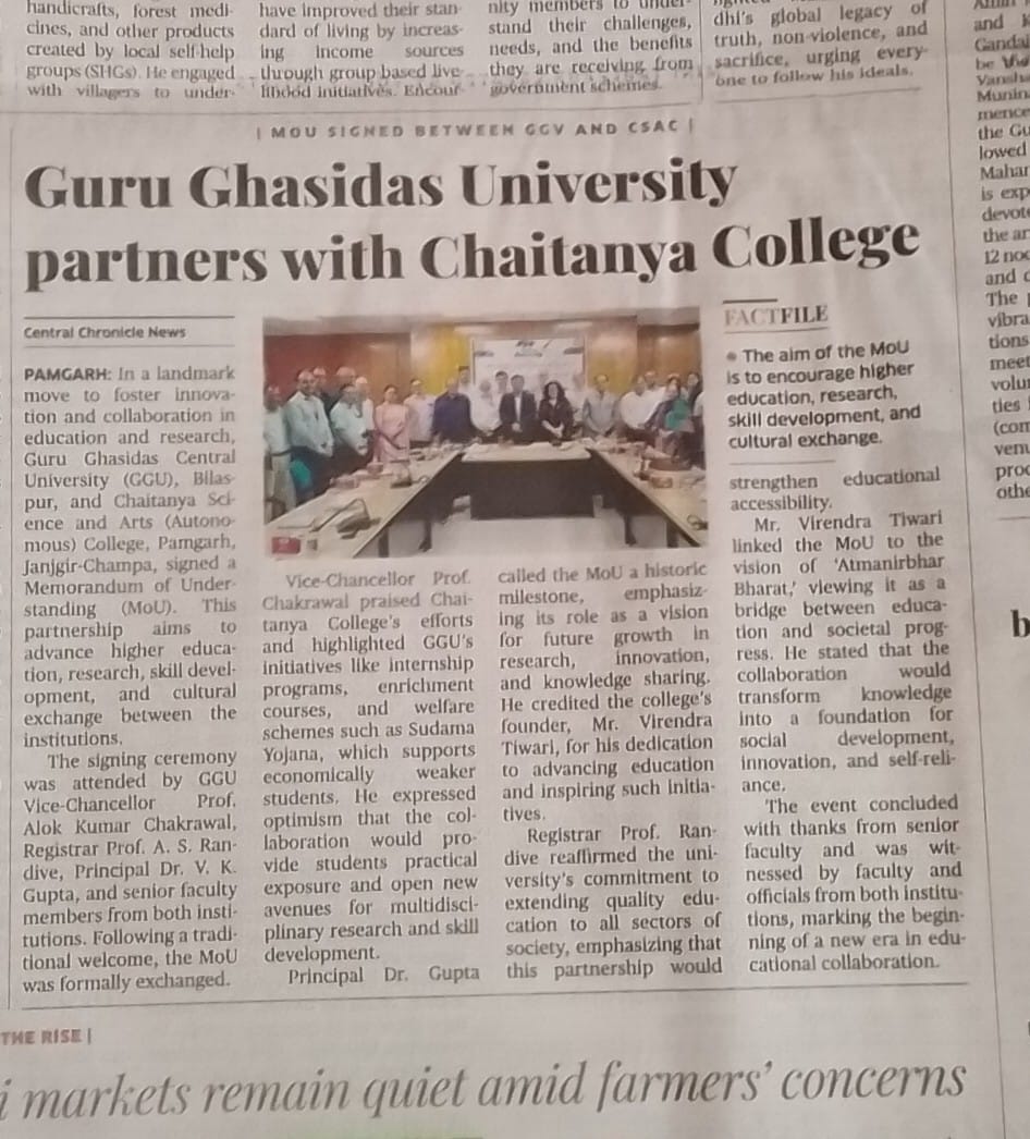 Chaitanya Science and Arts College, Pamgarh, in collaboration with WWF Bhopal, has taken a significant step towards promoting environmental conservation and research. The institutions signed a Memorandum of Understanding to foster awareness and encourage youth involvement in biodiversity preservation.